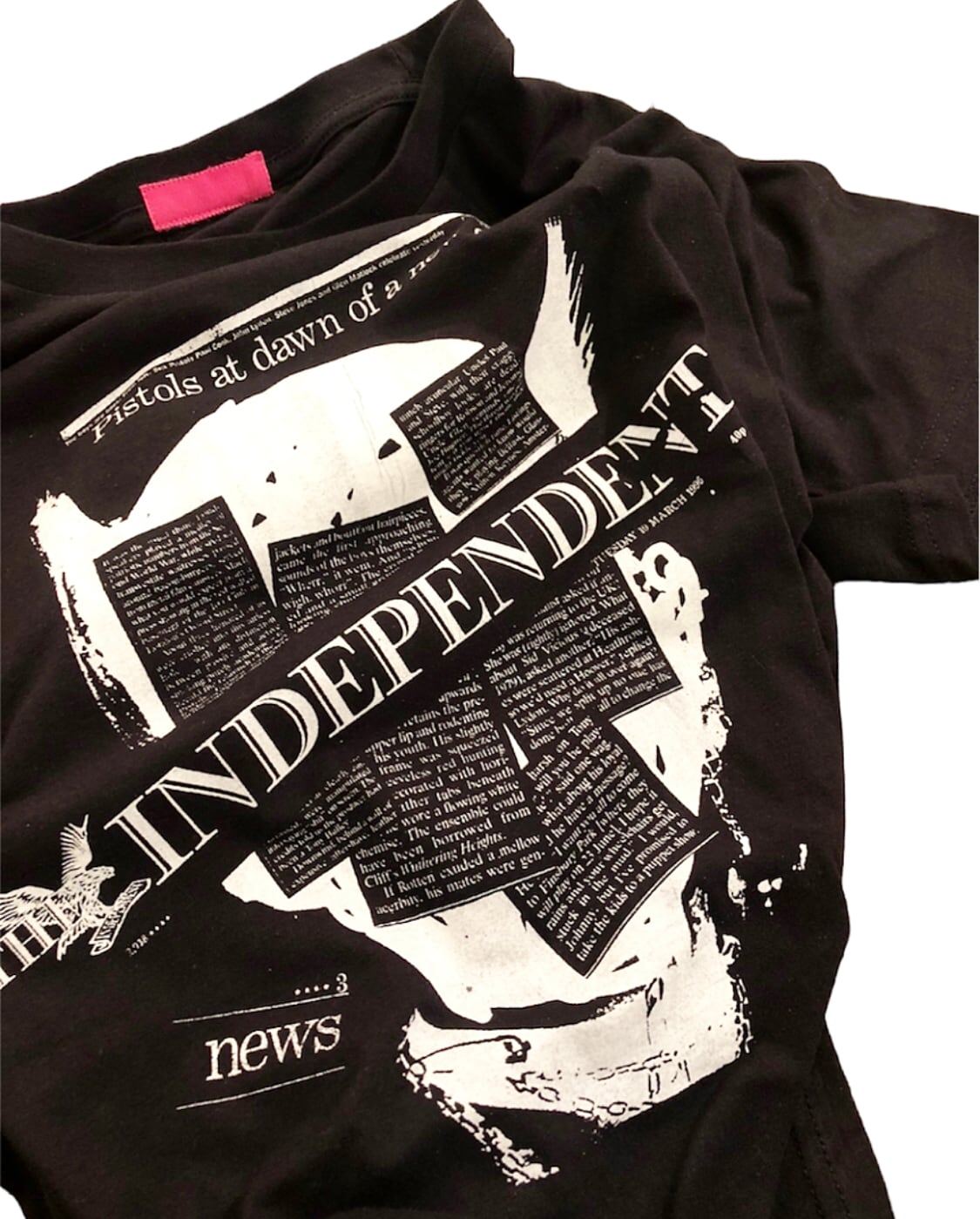 1996 London Finsbury park を皮切りに始まった Sex pistols 再結成World Tour が決定した時のイギリス The INDEPENDENT News paper の記事をCat w sue の上にコラージュしたデザインのT-shirts